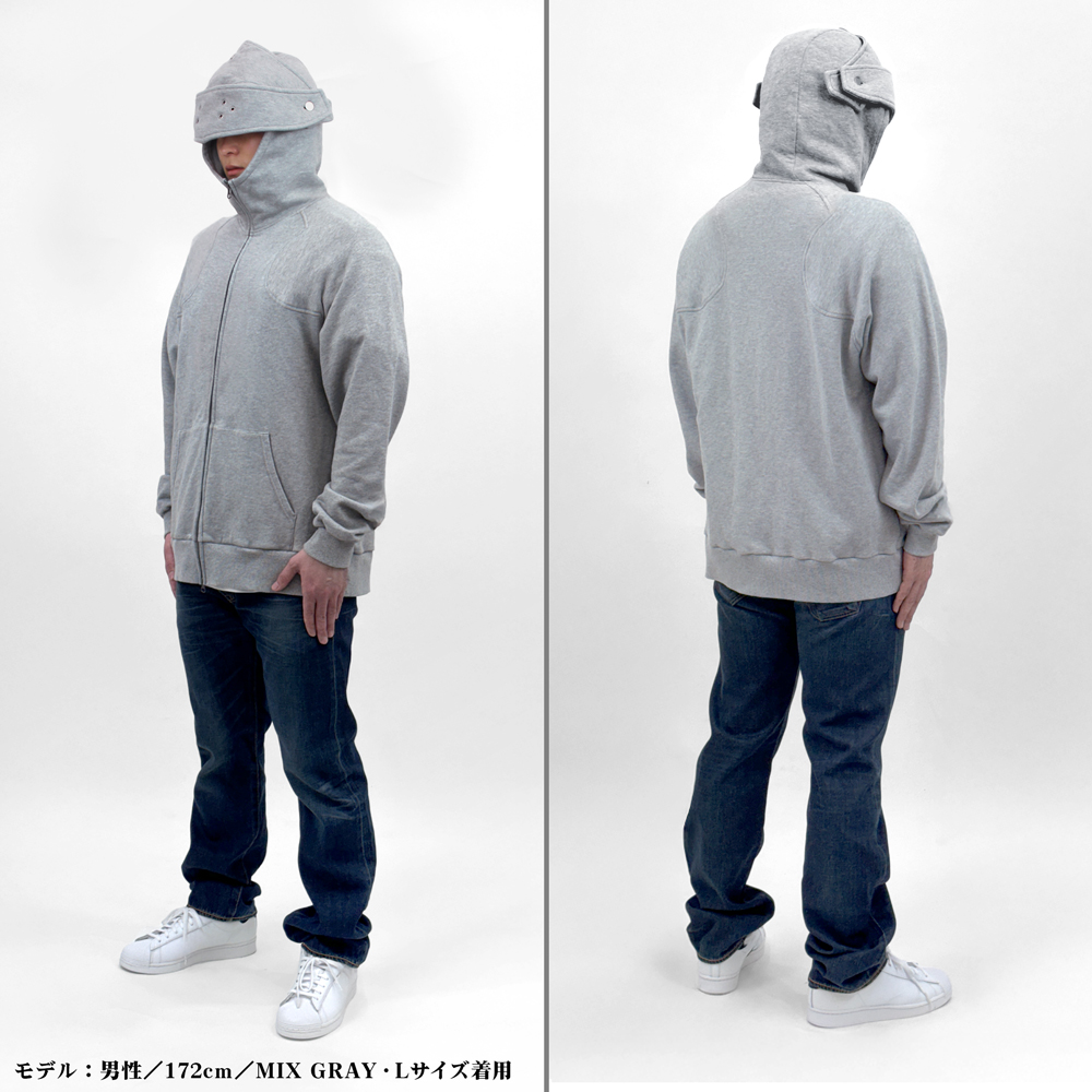 ・西洋の兜をイメージし設計されたフードのバイザーは額・目元・口元の三段階の位置に調整でき取り外しも可能。