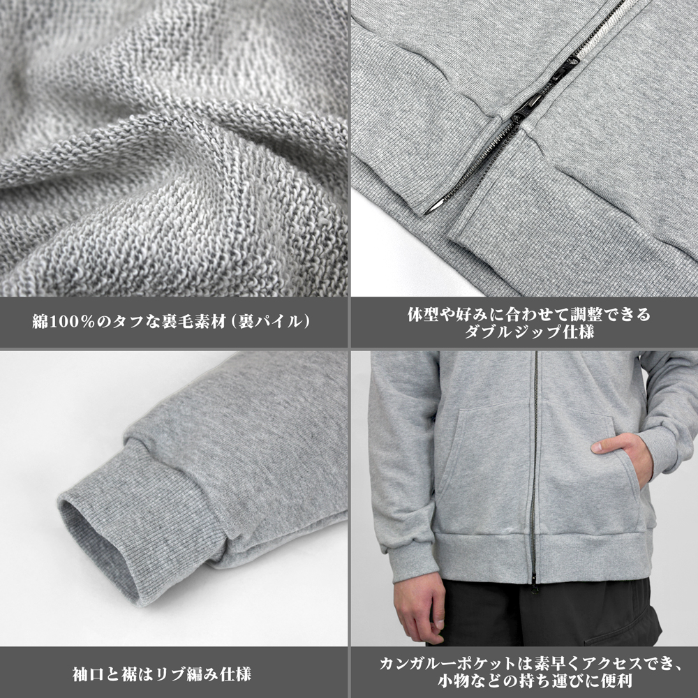 ・綿100%のタフな裏毛素材(裏パイル)。吸水・吸湿性に優れているので長時間着用しても快適。