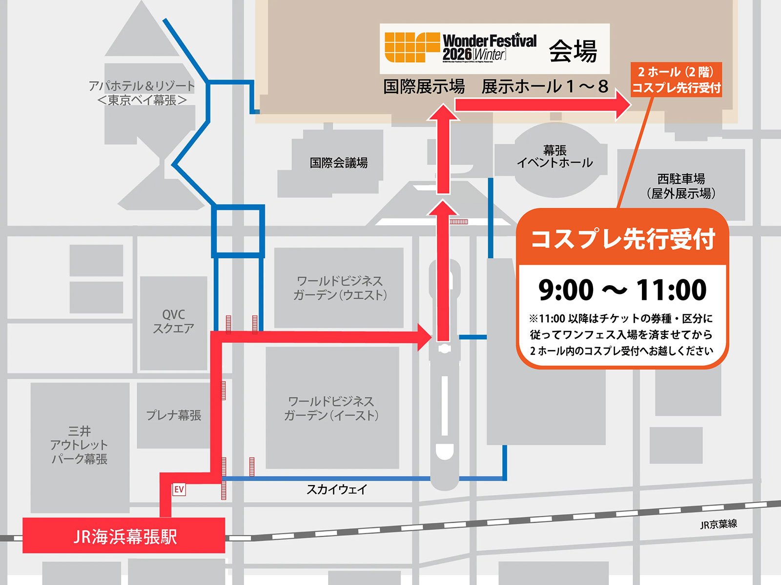 メッセモールを通って幕張メッセ中央エントランスへお進みいただき、2階の中央モールを通って2ホール「コスプレ受付」へお越しください。